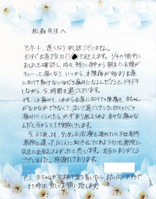 当院の治療で、妊娠された患者様の生のアンケートです。
