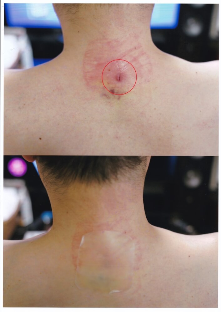 一般的な首の手術は、首の後ろを大きく切開(5~10㎝)して骨を削るものです。