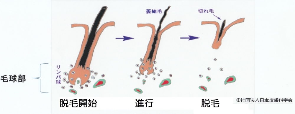 下記の画像のように (脱毛開始)成長期の毛根が免疫の暴走により過剰なリンパ球の攻撃を受けると ⇒ (進行)毛球の萎縮⇒ (脱毛)切れ毛、抜け毛に進みます。